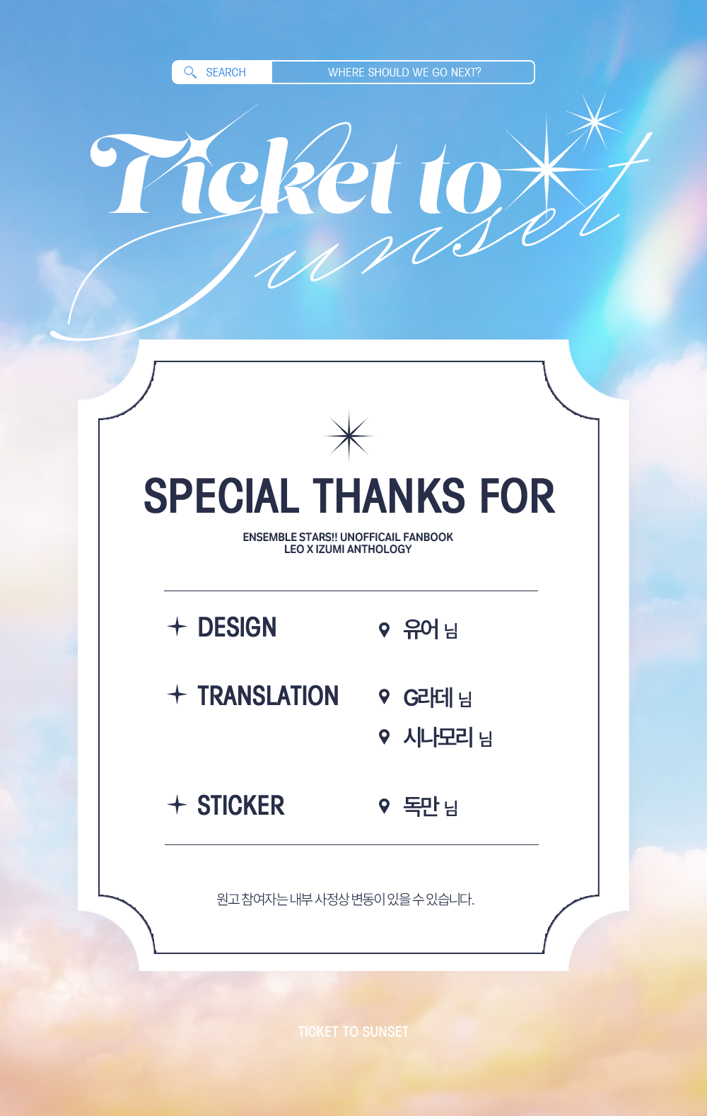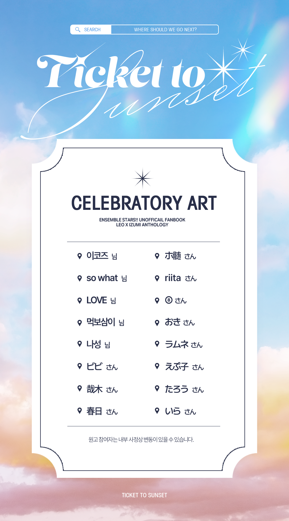 ์ค์ ์ฐธ๊ฐ์ง ์์ธํผ๋ ์ฒด 2026.02.20 list ๊ณต์ง ๊ณต์ง ๊ณต์ ํ๊ธฐ ๊ฒ์๊ธ ๊ด๋ฆฌ Ticket to Sunset '๊ณต์ง' ์นดํ ๊ณ ๋ฆฌ์ ๋ค๋ฅธ ๊ธ <Ticket to Sunset>์ํ ๋ชจ์ (0) 2026.03.10 ์ผ์ ์๋ด (0) 2026.02.11 0 ๊ณต์ง ํ์ฌ๊ธ ์ค์ ์ฐธ๊ฐ์ง ์ค์ ์ฐธ๊ฐ์ง more <Ticket to Sunset>์ํ ๋ชจ์ 2026.03.10 ์ผ์ ์๋ด 2026.02.11